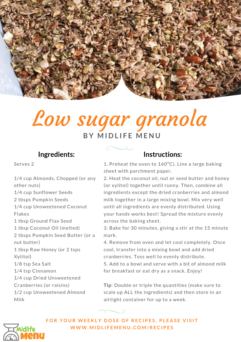 Are you looking for a lower sugar alternative to shop bought granola which tends to be really high in sugar? The problem with having a high carb/sugar breakfast is that it won’t keep you full for long and it can put you on the blood sugar roller-coaster for the day meaning you’ll crave sugar or carbs during the day.